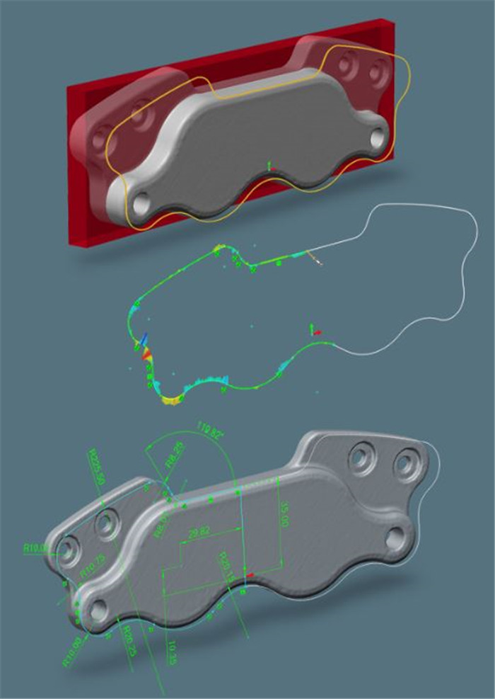 2、实体建模--从最优化的几何实体建立实体CAD模型 PolyWorks|Modeler实体模型原理包含优化在扫描的三角化模型上抽取的几何实体,然后将这些抽取的实体转化成全部基于特征的实体CAD模型,保证参数化,关联性,和完全可编辑的实体模型。